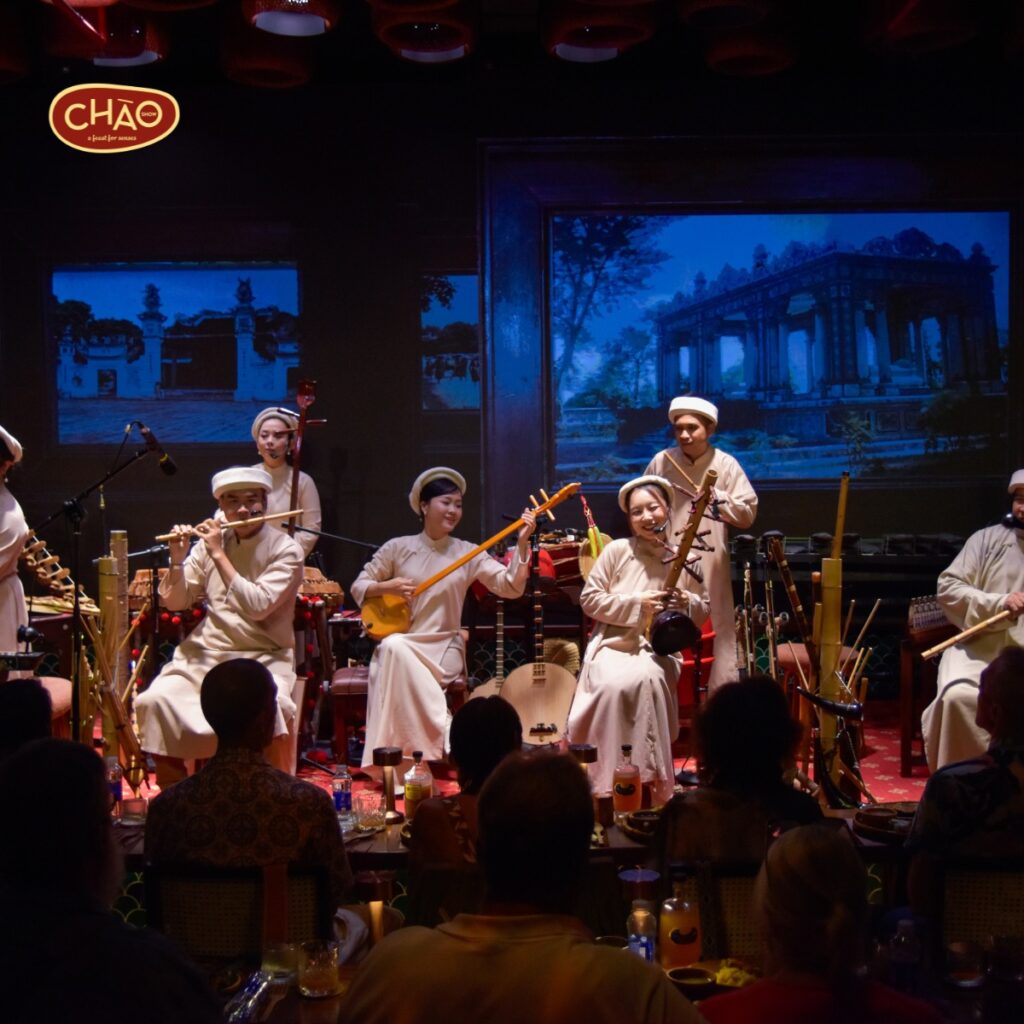 Hãy thử tưởng tượng bạn ngồi vào bàn ăn lúc 7 giờ tối, xung quanh là một căn phòng tối. Tiếng trống chầu bắt đầu từ phía sau lưng — rồi từ từ lan ra bốn phía, không phải từ một loa góc phòng, mà như thể âm thanh đang bao quanh bạn từ mọi hướng trong không gian 360 độ. Trước mặt là tô bún bò Huế. Bên cạnh là khúc bánh cuốn Hà Nội. Và trên sân khấu, người nghệ nhân đang chơi đàn tranh với ánh đèn hắt lên như trăng mùa thu.